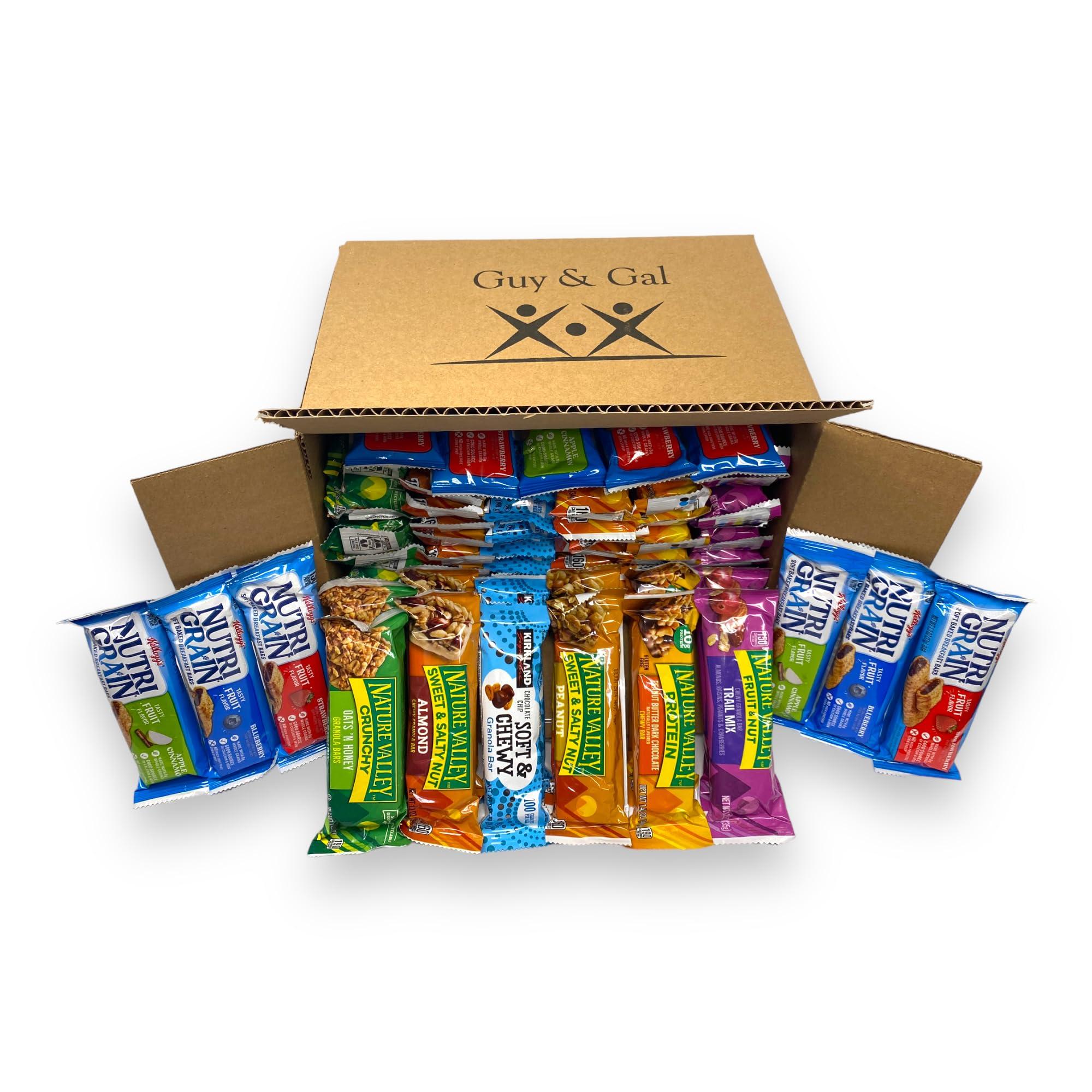Welcome to the delicious, nutritious world of Guy & Gal Granola Bars! Our Variety Pack includes 72 bars across 9 tantalizing flavors, catering to everyone from college students and office workers to health-conscious snack lovers.Vibrant Variety: Experience flavors ranging from classic Chocolate Chip to unique Sweet and Salty Peanut Bars. Our selection includes soft-baked fruit-filled bars, protein-rich options, and fruit and nut combinations to delight every palate.Chewy, Crunchy, Joyful: Enjoy the soft chew of chocolate chip granola bars or the satisfying crunch of oat and honey bars. Whether you prefer sweet, savory, or a mix, each bar offers a celebration of flavors. Ideal for Students & Professionals: Perfect as a college care package or office snack, these individually wrapped bars are great for fueling study sessions, powering through workdays, and curbing hunger during meetings. Gift of Health & Happiness: Consider our pack for healthy gift basketsideal for Christmas, care packages, or as a thoughtful gesture to a friend who values both taste and wellness. Nutrition Meets Convenience: Packed with wholesome ingredients, our bars are an excellent alternative to processed snacks. They're ideal for on-the-go lifestyles, breakfast additions, or post-workout treats. Active Lifestyle Ally: Designed for adventurers and gym enthusiasts, these bars are a convenient source of energy, easily fitting into backpacks, gym bags, or glove compartments. Family-Friendly Snacking: Suitable for all ages, our bars are perfect for packing in lunchboxes, family outings, or quick snacks before after-school activities. Elevate Your Break Room: Replace vending machine snacks with something healthier and more satisfying with our bulk pack. Embrace a lifestyle of taste, health, and convenience with every bite of our Guy & Gal Granola Bars Bulk Variety Pack. Unbox a world of snacking joy and wholesome goodness today!