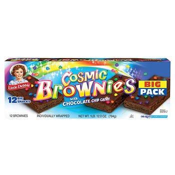 Little Debbie Cosmic Brownies with chocolate chip candy are a beloved favorite. The chewy, dark fudge squares are topped with delicious frosting and candy-coated with chocolate chips. The 12 individually wrapped brownies are an ideal addition to lunchboxes and make the perfect anytime snack. Made in the USA. Kosher.